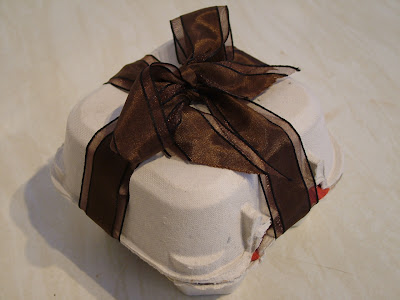 I put the eggs in a little 4-hole egg box which was saved from an easter present a few years ago- simple and quaint, i rather like it with the nice ribbon tied around it. I'd definitely make my own chocolate things again as it's not an expensive undertaking and, although slighty time consuming, is fun and carries the satisfaction of being homemade. However, i will definintely make sure that any chocolate has the full time in the fridge to make sure it's fully set before handling...i don't want anymore fingerprints!